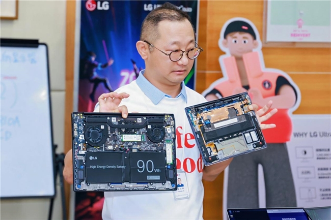在接下来的LG gram轻薄笔记本分享交流环节,R&D 研发负责人借助LG笔记本零配件拆解方式,通过现场铝合金和镁铝合金坚固度弯曲测试、笔记本重量猜猜猜,内部散热设计差异对比等多样的展示方式,让同学们了解到了LG gram轻薄工艺的苛求、对于轻薄背后可靠性的深度探索,以及对于LG gram简约美学设计理念。
